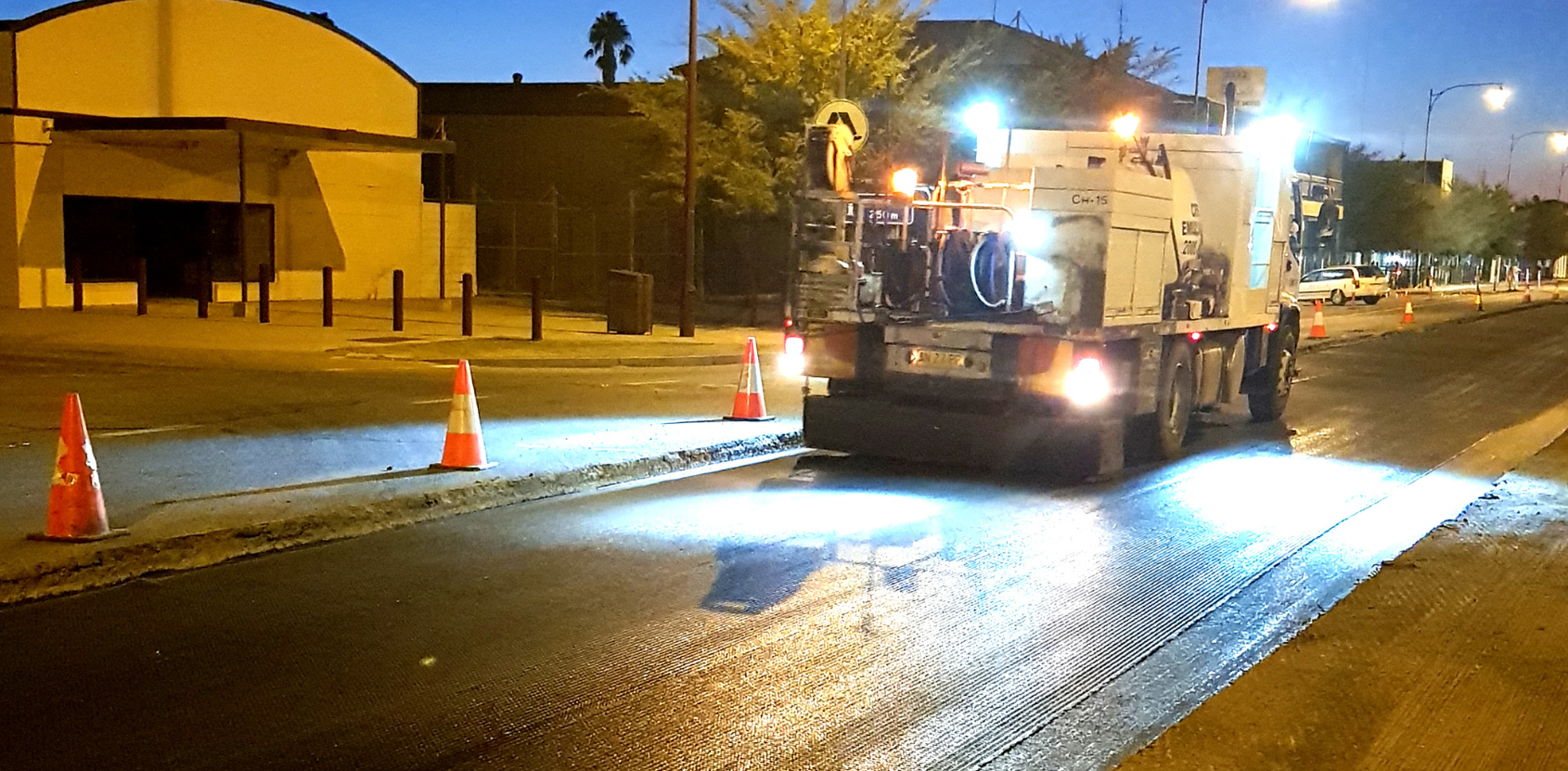 The night works to rehabilitate the pavement included installation of 18,000 m2 (two layers) of GlasGrid geogrid along the Newell Highway through the township of Jerilderie. G8511, 100 kN/m reinforcing grid was used for both layers